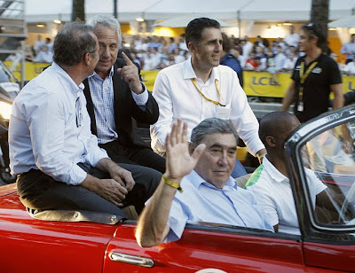 The endless caravan of carnival floats drove by... Then a vintage sports car with three fat blokes sitting on the boot and some old bloke in the front... Hang on... Bloody hell, Eddy Merckx, Greg Lemond, Miguel Indurain and Bernard Hinault!